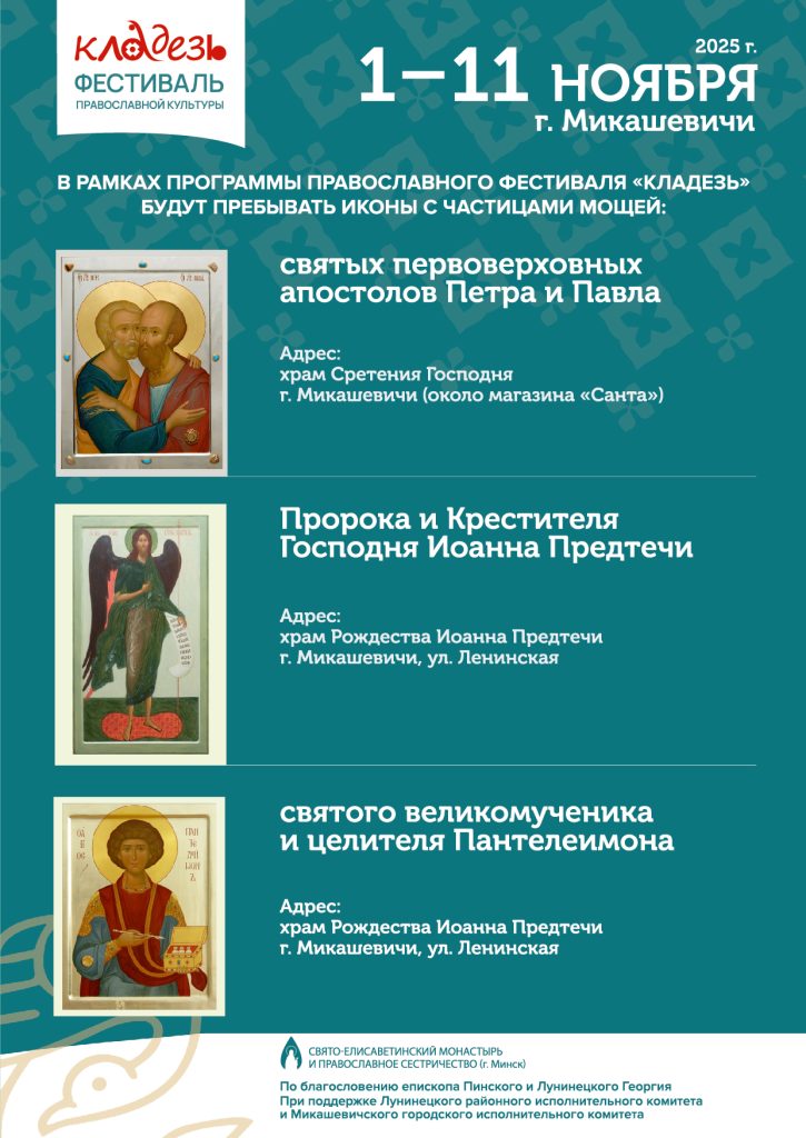 Особой благодатью для верующих станет пребывание в Микашевичах чтимых святынь. В городские храмы будут принесены иконы с частицами мощей святых апостолов Петра и Павла, Иоанна Предтечи и великомученика Пантелеимона.