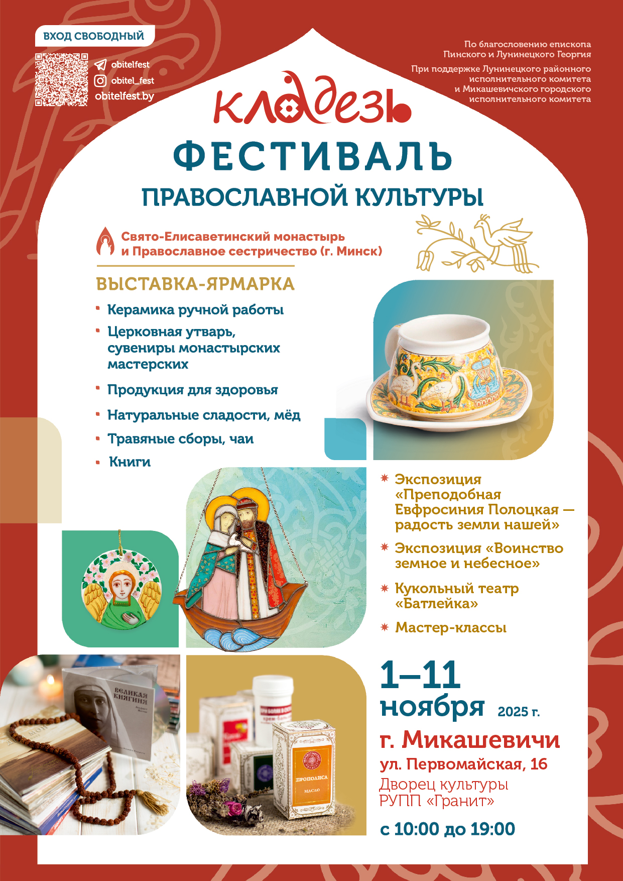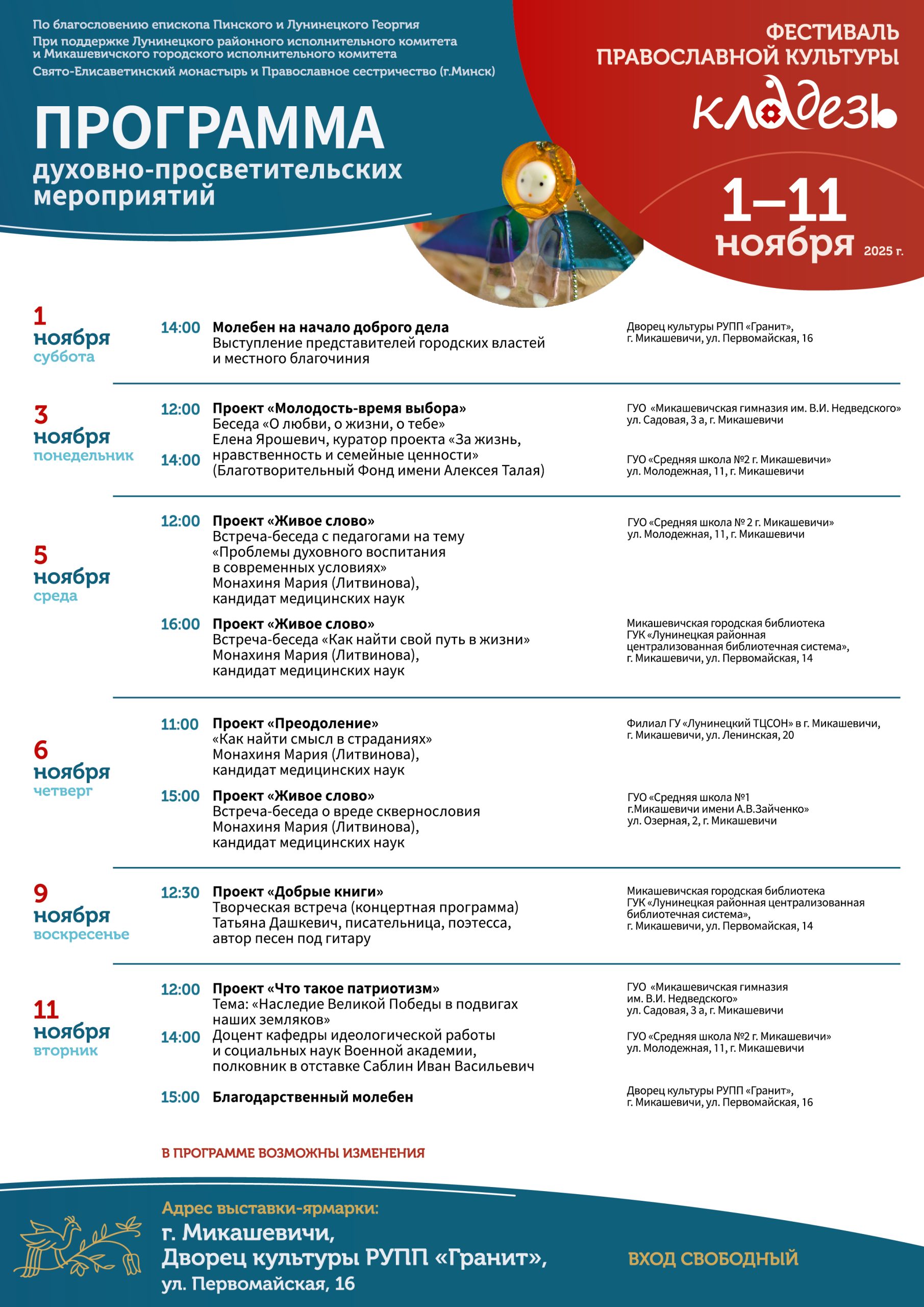 С 1 по 10 ноября в Микашевичах пройдет фестиваль православной культуры «Кладезь». Мероприятие развернется по адресу ул. Первомайская, 16 (Дворец культуры РУПП «Гранит») и станет для жителей города настоящим духовным и культурным событием. Фестиваль «Кладезь» — это пространство для всей семьи, где можно найти душевное тепло, вдохновение и познавательный отдых.