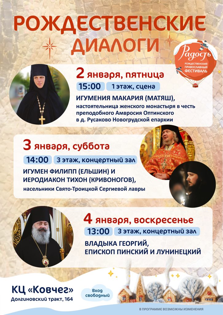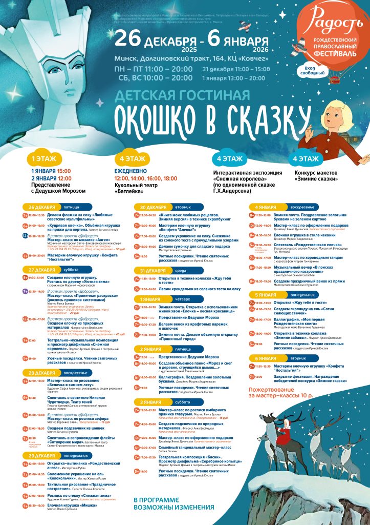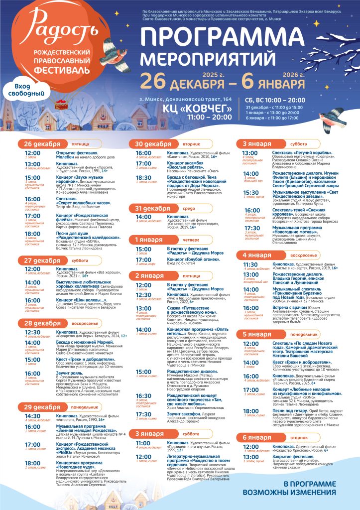 Международный рождественский православный фестиваль «Радость» пройдет в Минске с 26 декабря 2025 года по 6 января 2026 года. В дни фестиваля в культурном центре «Ковчег» вы погрузитесь...
